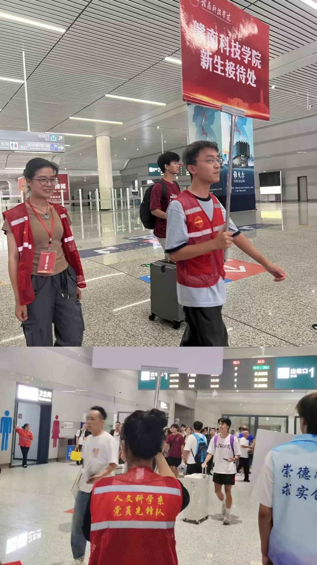 清晨,九游体育官方网站本科生第一、第二党支部的迎新志愿者们便身着统一的“红马甲”,手持醒目的引导牌,早早地守候在赣州西站、黄金机场的出站口。学生党员们坚守岗位,团结协作,在新生出站时上前接待并帮忙搬运行李,引导新生到学校接待处并分批次乘坐车辆到校报到。他们面带微笑,全天守候,轮流值班,以饱满的热情迎接每一位新生及家长的到来,充分展现了党员的良好风貌。