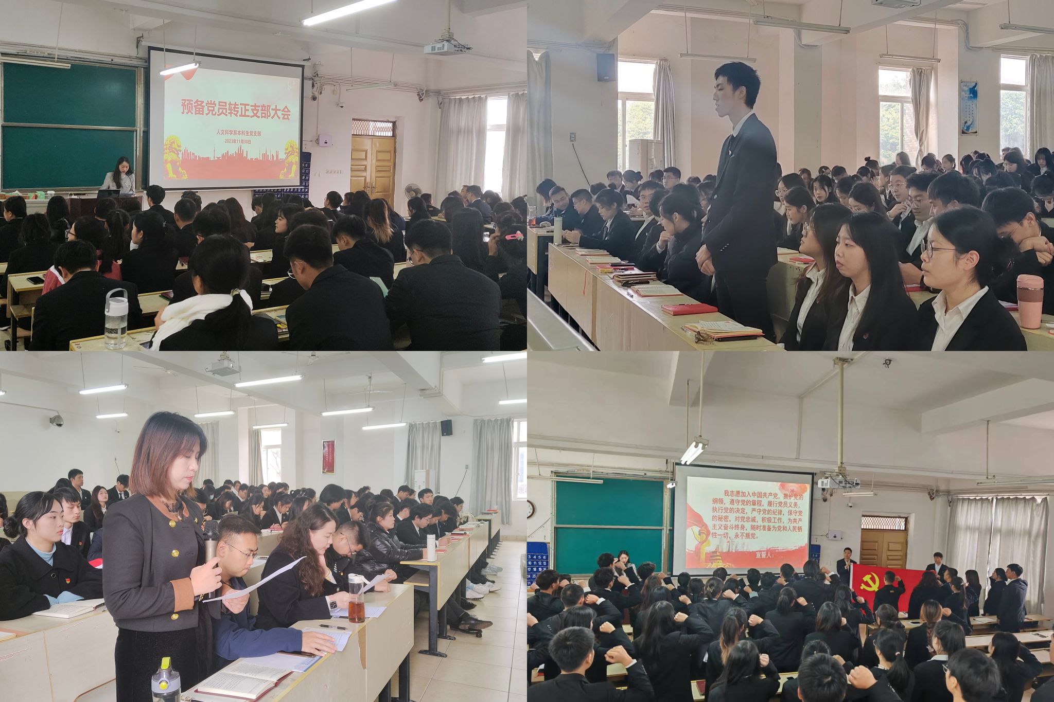 会议共分为接收预备党员和预备党员转正两个阶段。会议伊始,吴婷婷等31名发展对象依次表达入党动机和她们要加入中国共产党的愿望。入党介绍人分别对申请人的学习成绩、工作态度及日常生活表现进行介绍。而后,支部支委会向支部大会报告对申请人的审查情况,与会党员发表意见,对申请人能否入党进行充分讨论。与会成员一致认为,吴婷婷等31名同志入党动机端正,党员责任意识强,具备共产党员的条件。经过无记名投票表决,大会一致同意接收吴婷婷等31名同志为中共预备党员。之后,她们纷纷表示,在今后的学习工作中将更加严格要求自己,努力改正自身不足,积极向优秀共产党员学习。
