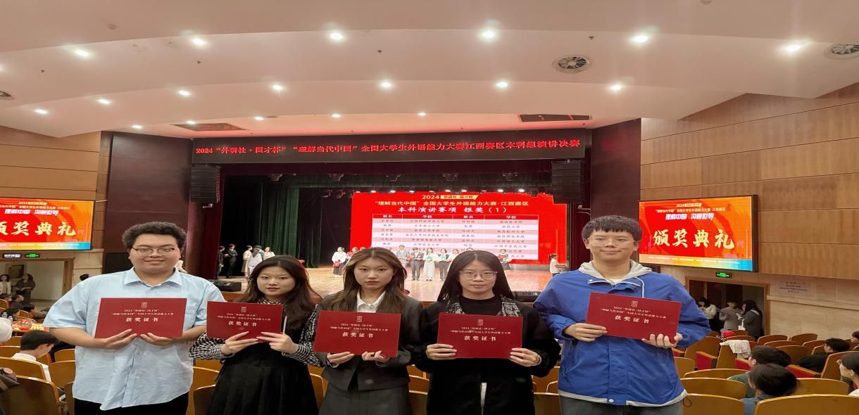 英语专业学生在专业教师指导下,积极将课内所学听说读写译技能应用于实践,积极参加各类学科竞赛,成绩斐然。近三年,学生在各类英语竞赛中获国家奖 40 余项,省级奖60余项 。特别是在2024年国A类赛事的“外研社•国才杯”“理解当代中国”全国大学生外语能力大赛的英语综合能力赛中,九游体育官网英语专业学生在英语综合能力江西赛区获一等奖1项二等奖3项。2024年学校首次组织学生参加“外研社•国才杯”“理解当代中国”全国大学生外语能力赛的笔译和口译大赛,英语专业学生获江西赛区省级二等奖4项。在2023年“外研社•国才杯”“理解当代中国”全国大学生外语能力大赛中,演讲大赛江西赛区银奖2项,铜奖1项;英语阅读大赛江西赛区铜奖2项;英语写作大赛国家级铜奖1项,江西赛区金奖1项,银奖1项,创历史最好成绩。