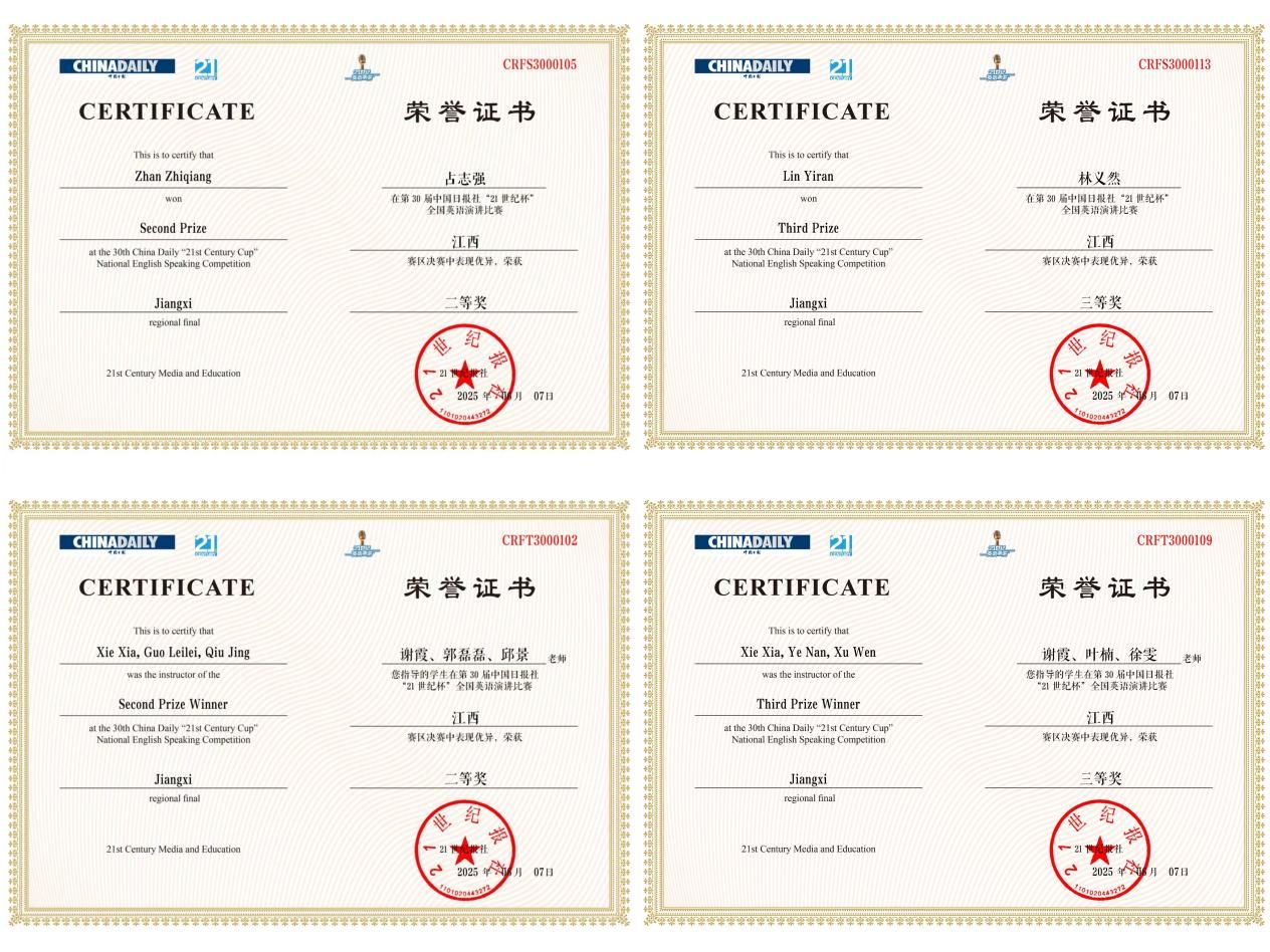 本网讯:6月7日,第30届中国日报社“21世纪杯”全国英语演讲比赛江西赛区复赛在南昌大学顺利举行,九游体育官网英语231占志强,法学232班林义然分获江西赛区二等奖、三等奖。
