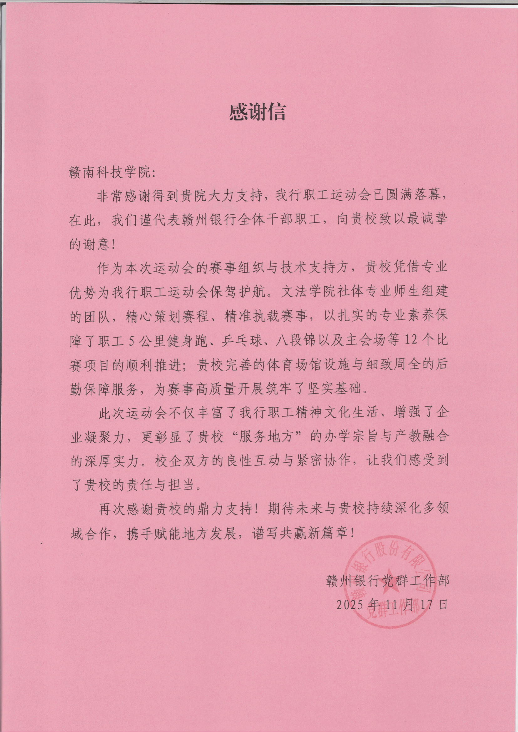 据悉,本届运动会历时七天,包括了5公里健身跑、乒乓球、八段锦、趣味项目等比赛项目,参与人数1000余人次,运动会结束后,赣州银行还专程发来感谢信,感谢学校的大力支持配合、感谢九游体育官网师生专业和细致的服务。