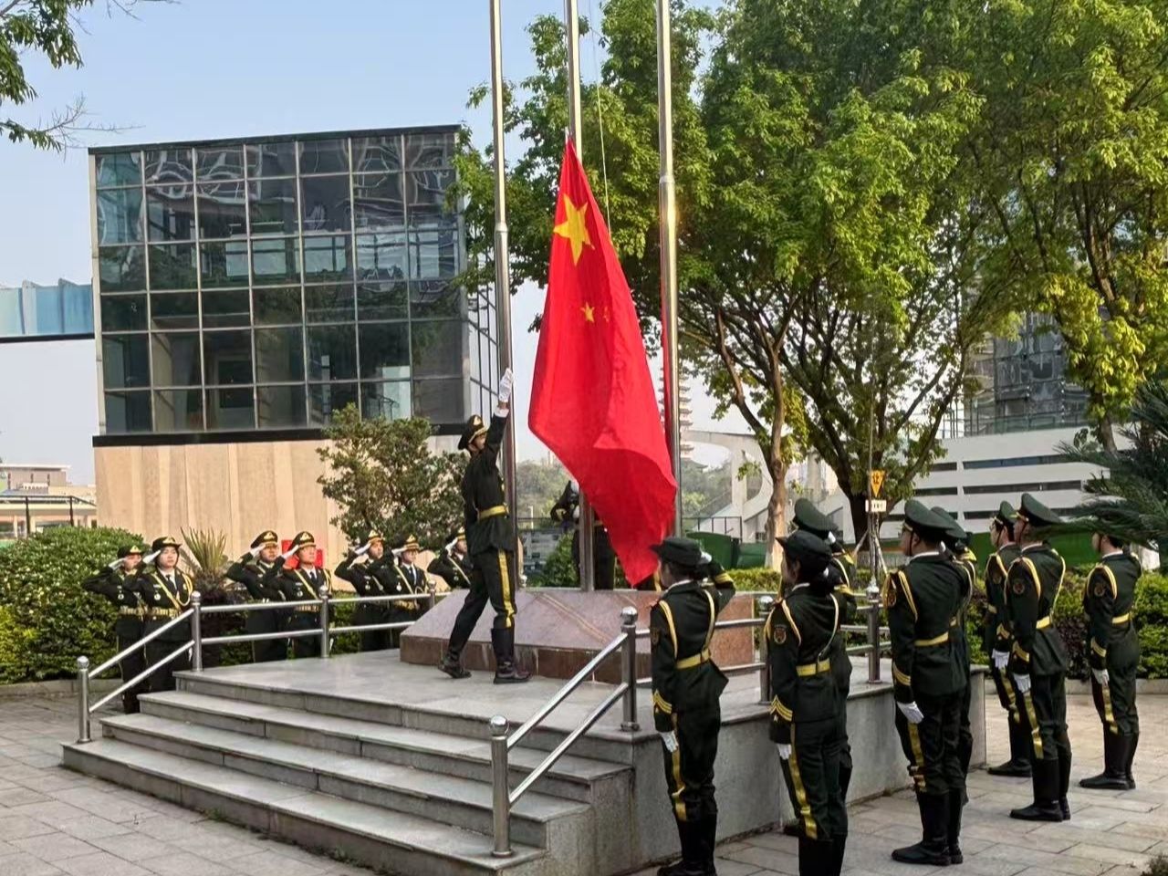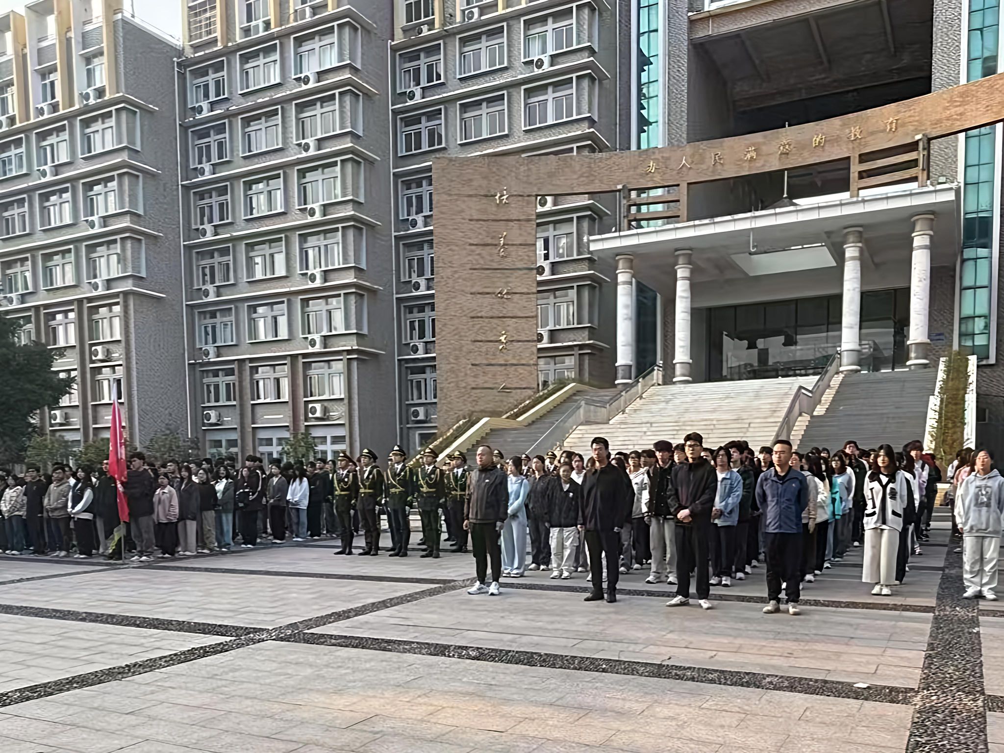 伴随《义勇军进行曲》的激昂旋律,五星红旗缓缓升起,全体师生神情肃穆,行注目礼,奏唱国歌。