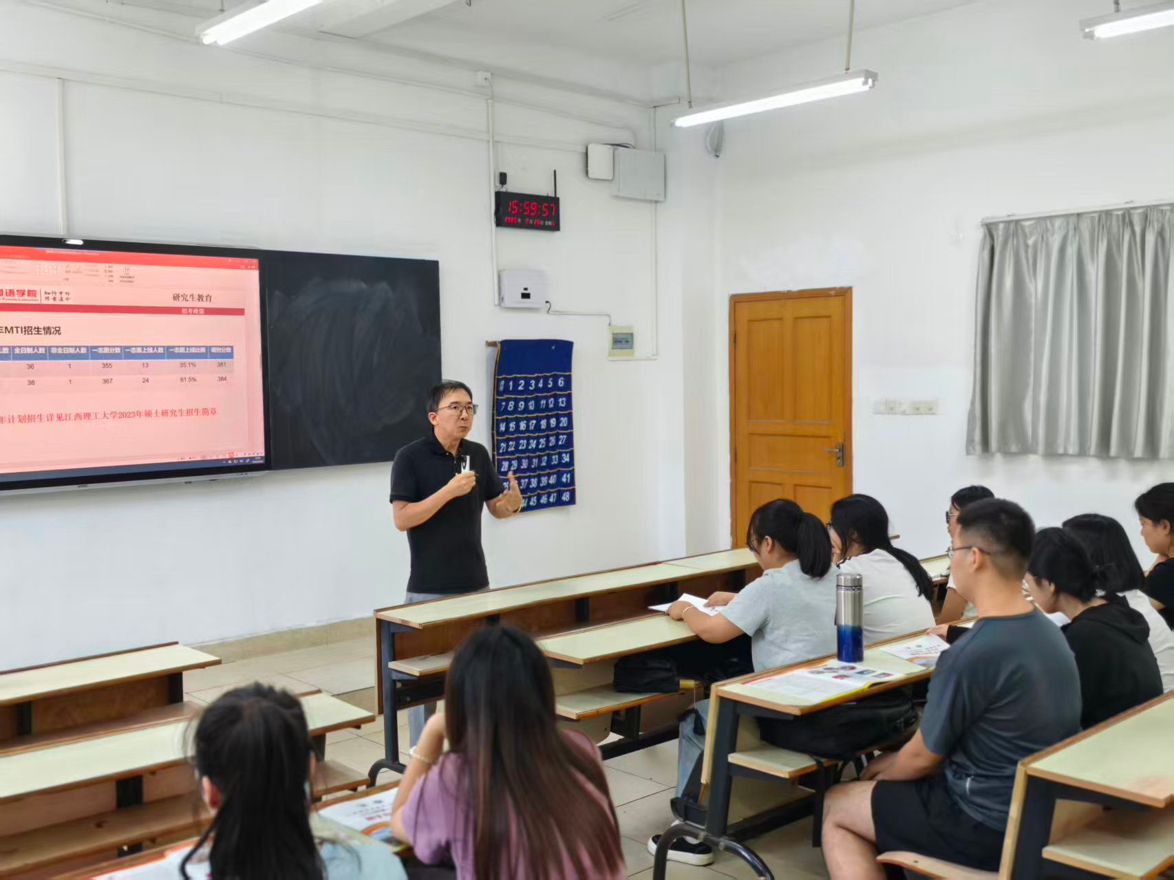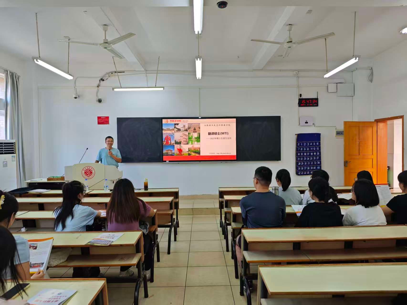 本网讯:2025年全国硕士研究生报名在即,9月26日下午,九游体育官方网站英语教研室邀请江西理工大学外国语学院翻译硕士专业学位(MTI)硕士点负责人张建平教授、汉语国际教育专业硕士点翻译硕士学位点负责人钟舟海副教授、2026级研究生班主任蔡强副教授,给学院英语专业22级和23级学生开展考研指导讲座。