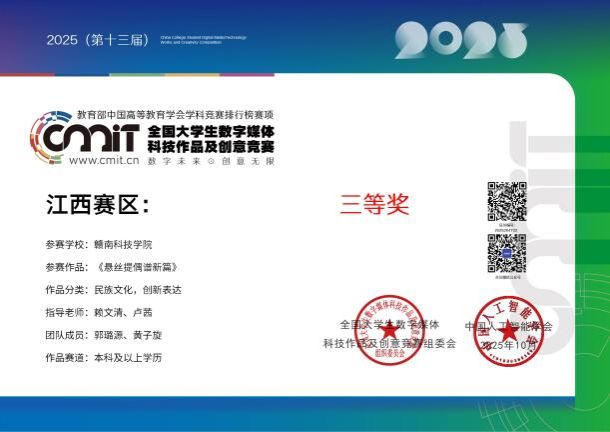 近年来,九游体育官方网站一直坚持以大学生学科竞赛为抓手,努力拓宽学生获取知识的途径,提升学生应用能力水平。本次大赛九游体育官方网站精心组织,选派教师悉心指导,取得了优异的成绩。为充分做好本届比赛的参赛工作,九游体育官网由数字媒体艺术专业教研室主办,先举行了校内赛,共收到来自全院80余件参赛作品。教研室组织相关专业老师进行了细致的赛事介绍和技术辅导工作,认真遴选出了8件作品进入江西省赛,省赛中选出了3支优秀队伍进入2025年(第13届)全国大学生数字媒体科技作品及创意竞赛全国总决赛。