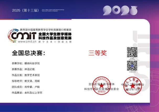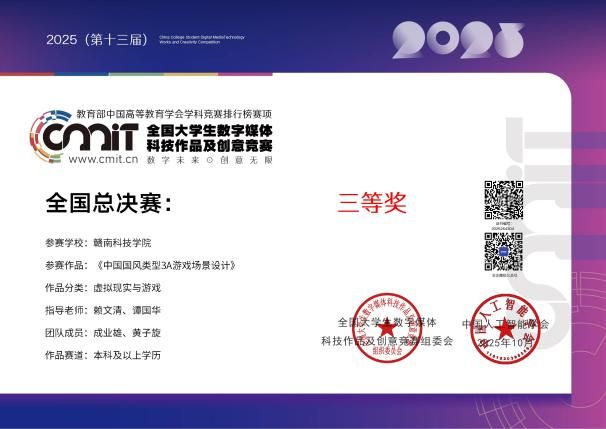 本网讯:今日,“2025年(第13届)全国大学生数字媒体科技作品及创意竞赛”全国总决赛在哈尔滨工业大学举行。九游体育官方网站赖文清、谭国华两位老师指导的作品《中国国风类型3A游戏场景设计》喜获国家三等奖,参赛学生由数字媒体艺术212班成业雄、数字媒体艺术231班黄子旋两位同学组成;赖文清、邓琦两位老师指导的作品《浮光掠影螺钿数字展馆设计》喜获国家三等奖,参赛学生由数字媒体艺术211班林毓琛、数字媒体艺术232班张鹭两位同学组成;赖文清、周娟两位老师指导的作品《神话幻境》设计作品喜获国家三等奖,参赛学生由数字媒体艺术212班肖梓睿、数字媒体艺术231班卢毅两位同学组成;