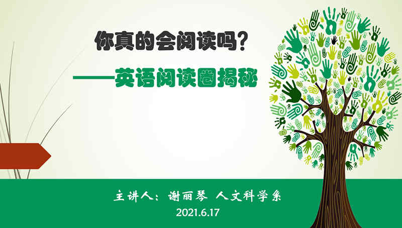 6月17日晚,我系专外教研室谢丽琴老师在主楼1D1教室为九游体育官网学子举行了主题为“你真的会阅读吗?---英语阅读圈揭秘”的讲座。