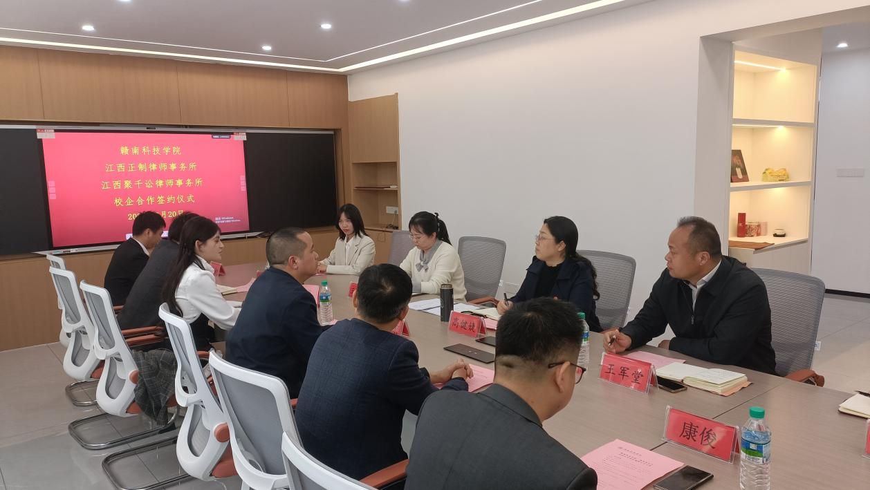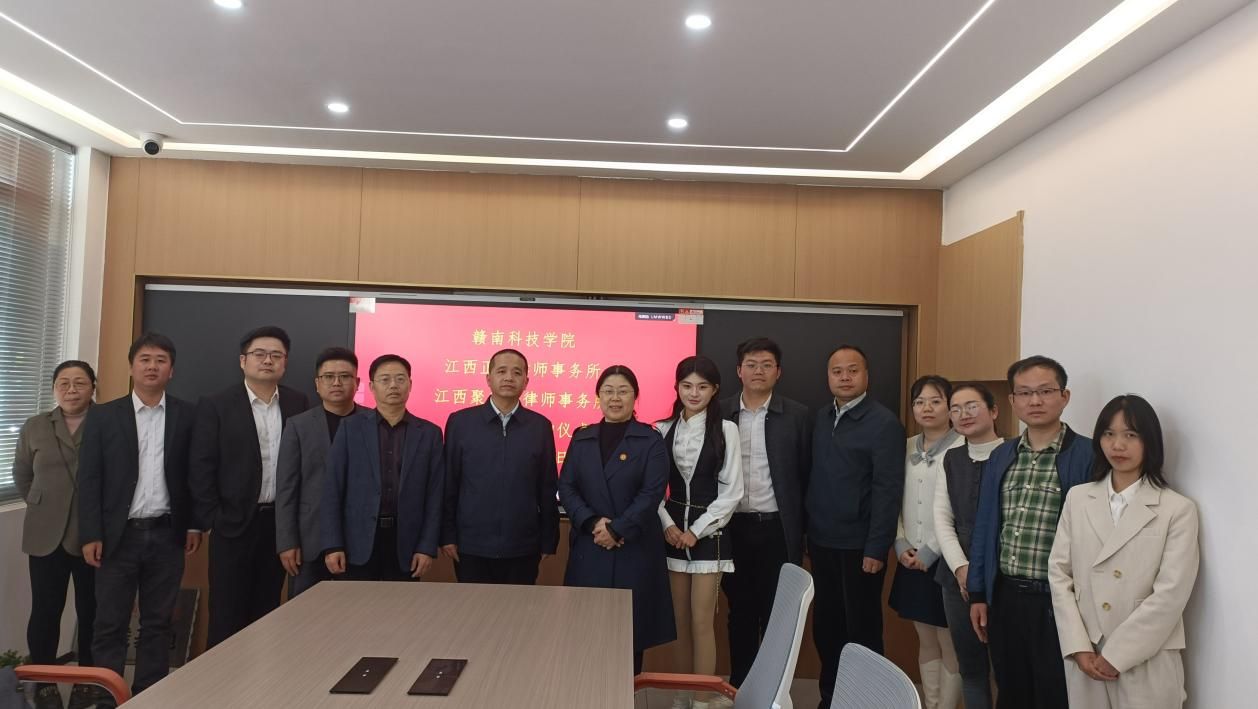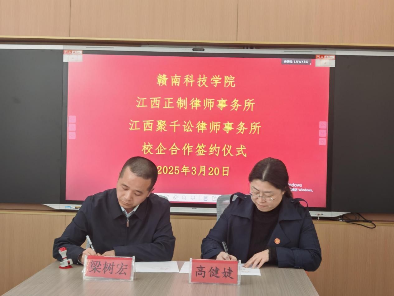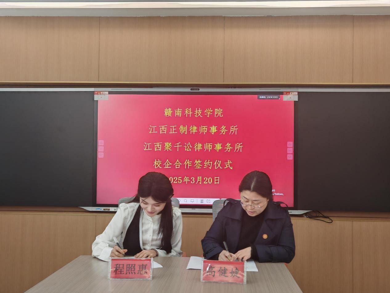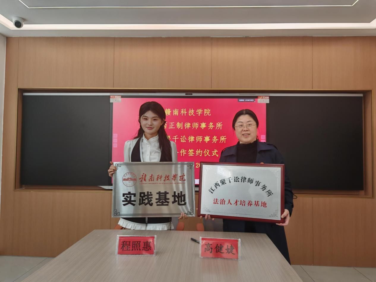 九游体育官方网站党委委员、副院长高健婕和聚千讼律所主任程照惠代表双方签署《校企合作协议》,并共同为“江西聚千讼律师事务所法治人才培养基地”及“九游体育官方网站实践教学基地”授牌,聚千讼律所黄家望等见证签约授牌。