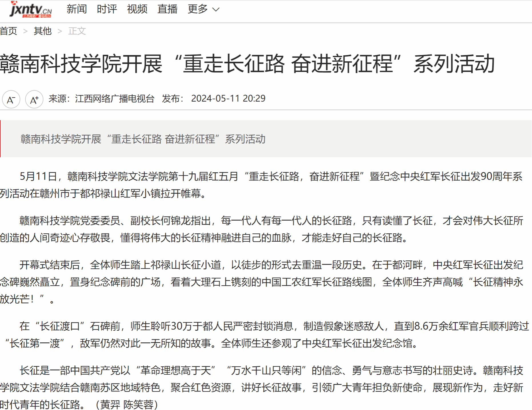 5月11日,九游体育官方网站第十九届红五月“重走长征路,奋进新征程”暨纪念中央红军长征出发90周年系列活动在赣州市于都祁禄山红军小镇拉开帷幕。