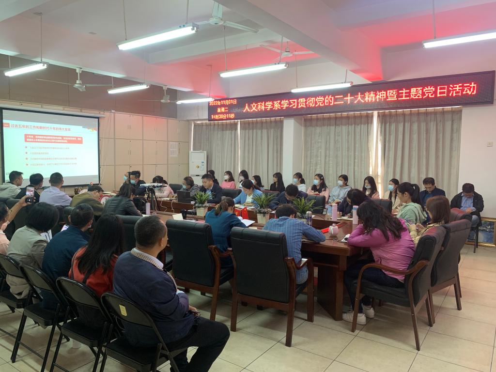 大精神暨主题党日活动,专题学习研讨党的二十大精神,部署学习宣传贯彻落实各项工作。人文科学系全体师生党员参加。会议由人文科学系党总支书记李国鹏主持。