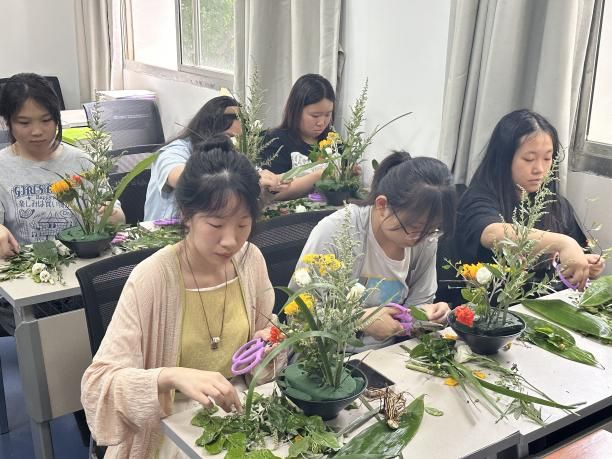 谢东琳以东西方插花文化的差异性导入本次课程的主题,通过各国插花文化的历史变迁和相互借鉴比较,激发同学们的民族自豪感。在宋代花艺体验过程中,谢老师让同学们共同协作引导大家探索“宋韵插花”的魅力。同学们通过课程不仅了解了宋代插花的人文精神,学习了宋代插花的技艺,体会了“插花是立体绘画”的含义,同时,还对宋代“平淡天真、高洁清雅”的审美价值与精神追求有了深刻认识。