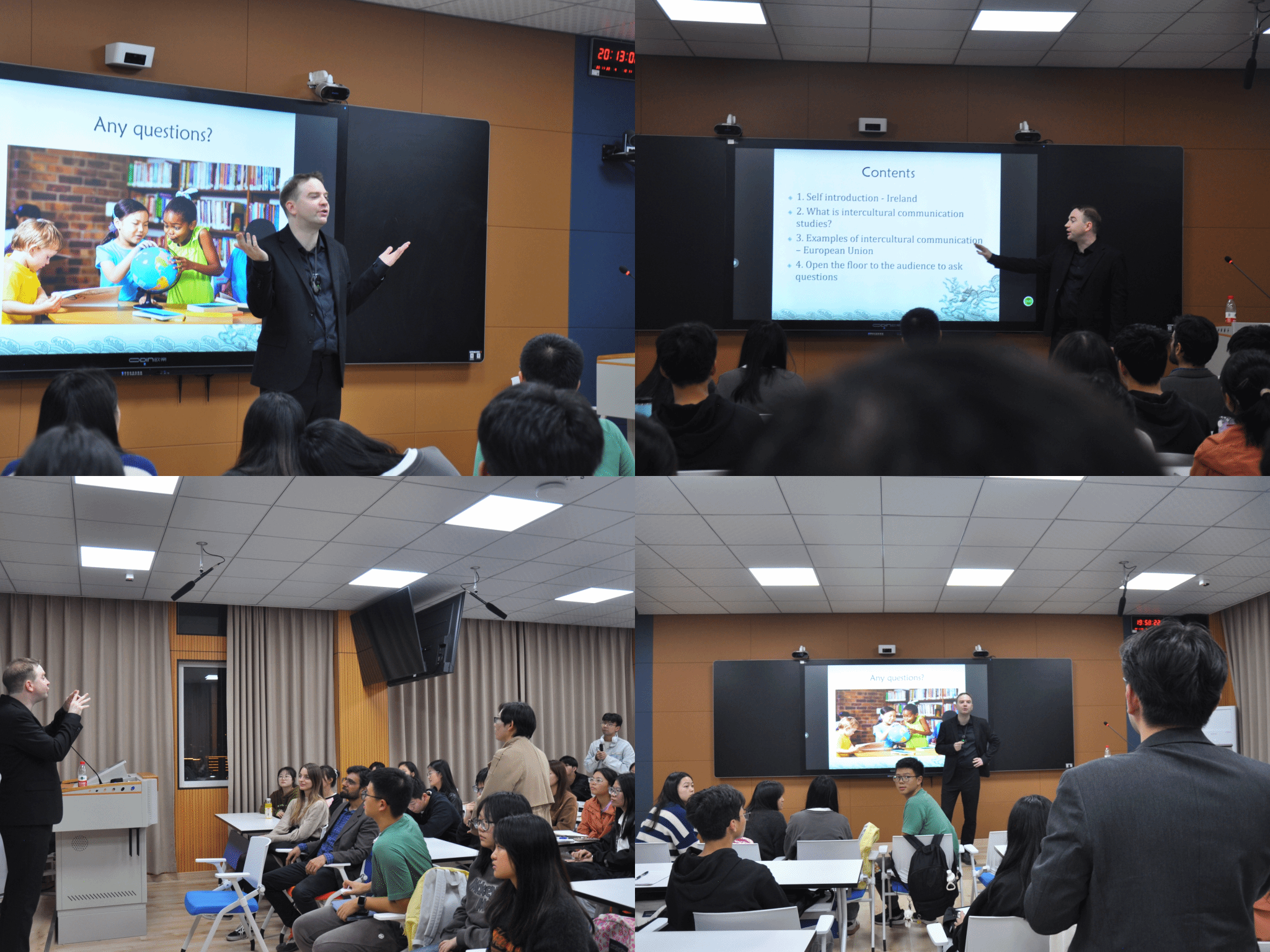 唐纳教授凭借其多年的跨文化教学及研究经验,对爱尔兰的风土人情进行了全面且有趣的阐述,使得在场的学生们对爱尔兰产生了浓厚的兴趣。随后,唐纳教授以欧盟为例,从四个方面进行了讲解,深入剖析了跨文化交流的概念、重要性、障碍以及应对措施。他以清晰且深入的讲解方式,揭示了跨文化交际的总体结构,并逐步进行分解。在互动环节中,唐纳教授与现场的师生就爱尔兰的文化习俗以及如何开展跨文化交际等问题进行了热烈的讨论。通过互动,同学们更加深入地了解了爱尔兰的文化特色以及跨文化交际的方法和技巧。
